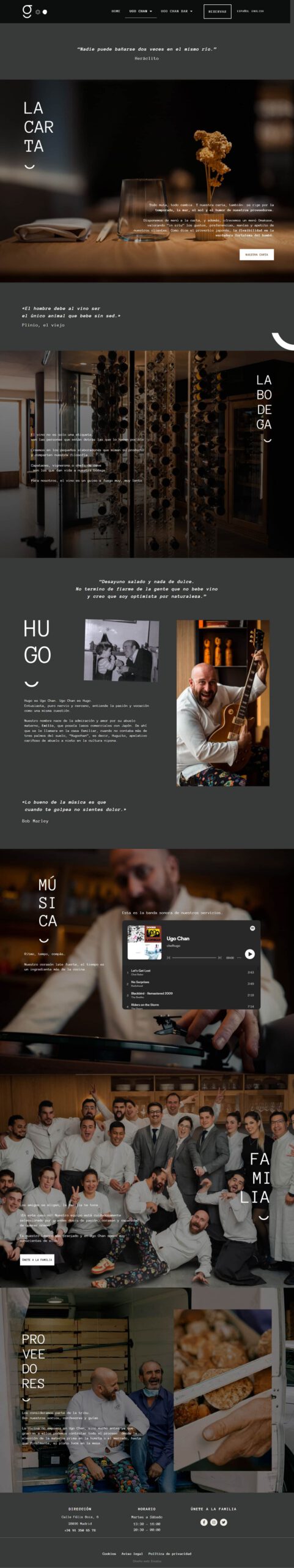 Para este proyecto, fue esencial la estrecha colaboración con el cliente, que además de aportar un material fotográfico espectacular que protagonizaría la página web, nos facilitó el contenido de cada sección, que íbamos maquetando a tiempo casi real: textos corporativos, carta, carta de vinos, fotografías….